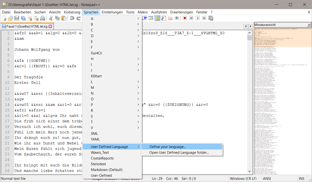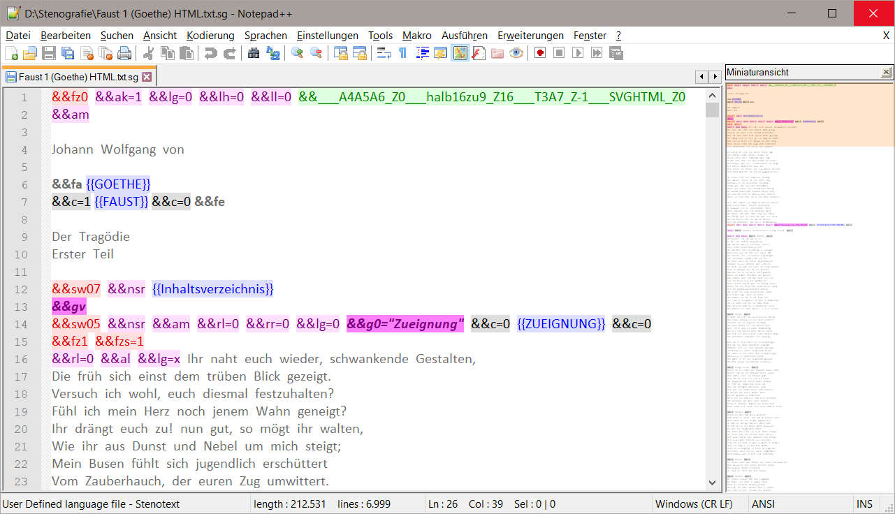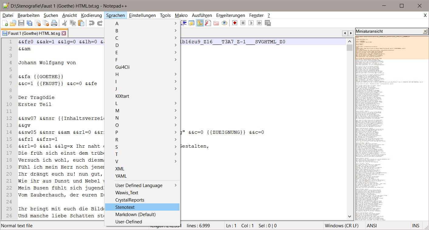 Nach jedem Öffnen Ihres Ausgangstextes in Notepad++ müssen Sie für die farbige Auszeichnung die Sprache Stenotext erneut zuweisen.